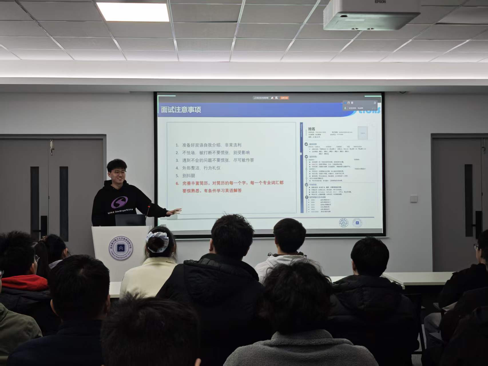 在自由问答环节,同学们围绕个人关切踊跃提问,分享嘉宾结合自身经历给予了细致解答,现场互动积极,交流氛围热烈。